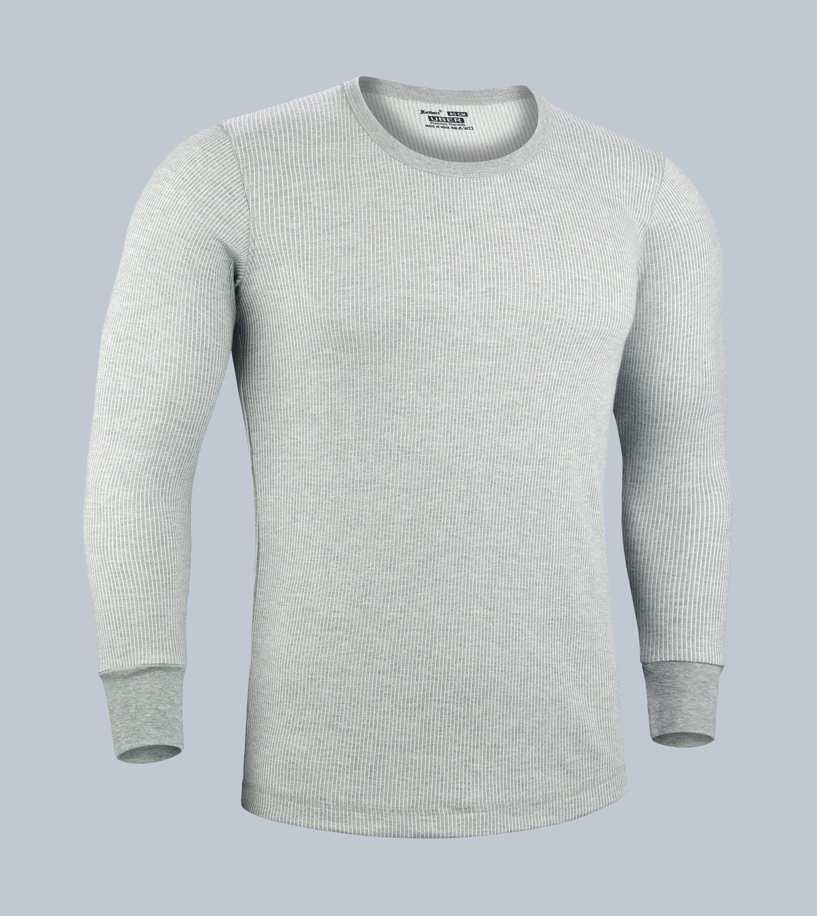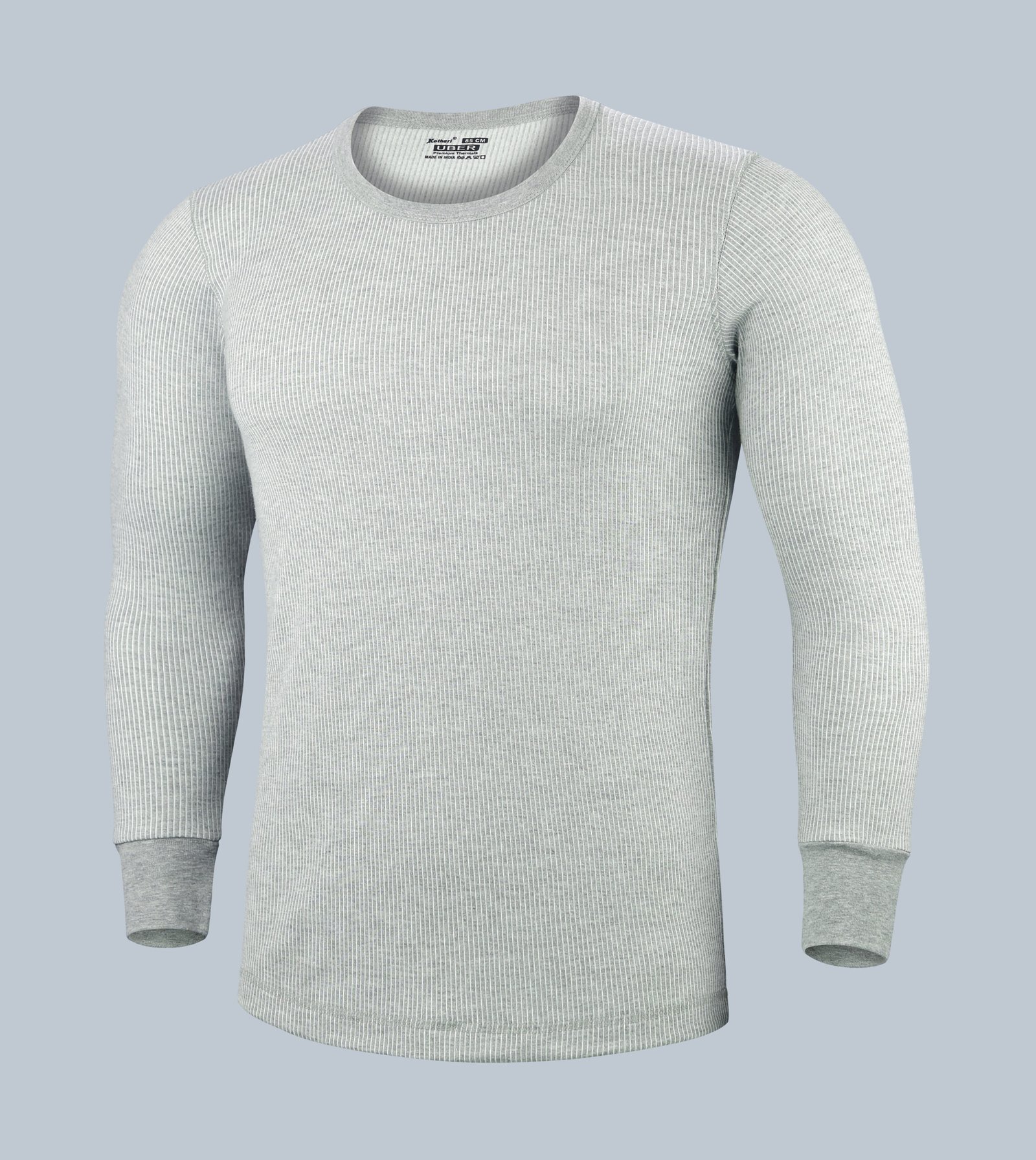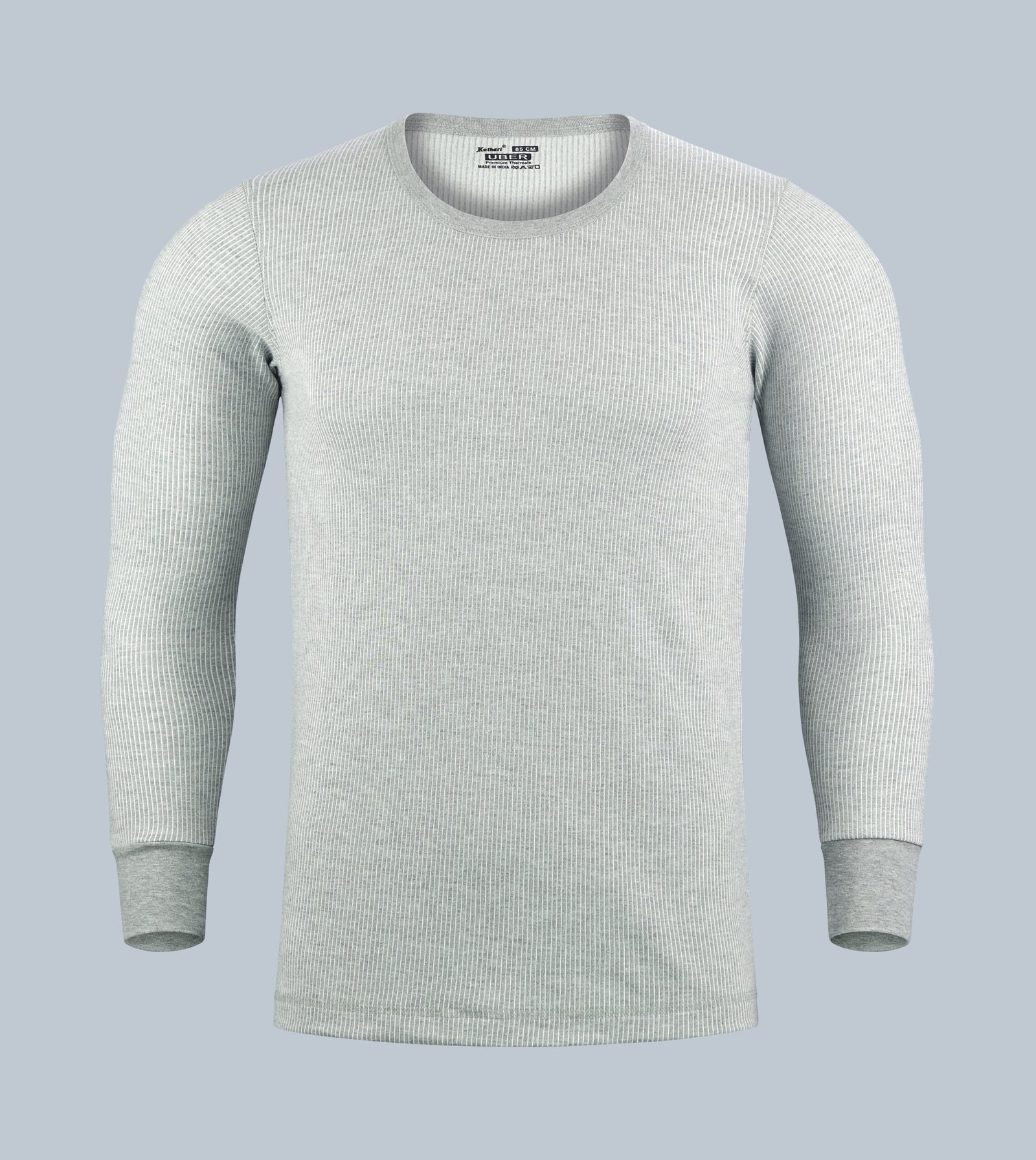 Kothari UBER Men’s Thermal Top in Grey with Stripes, Round Neck, Full Sleeves, Anti-Bacterial, and Low Neck.